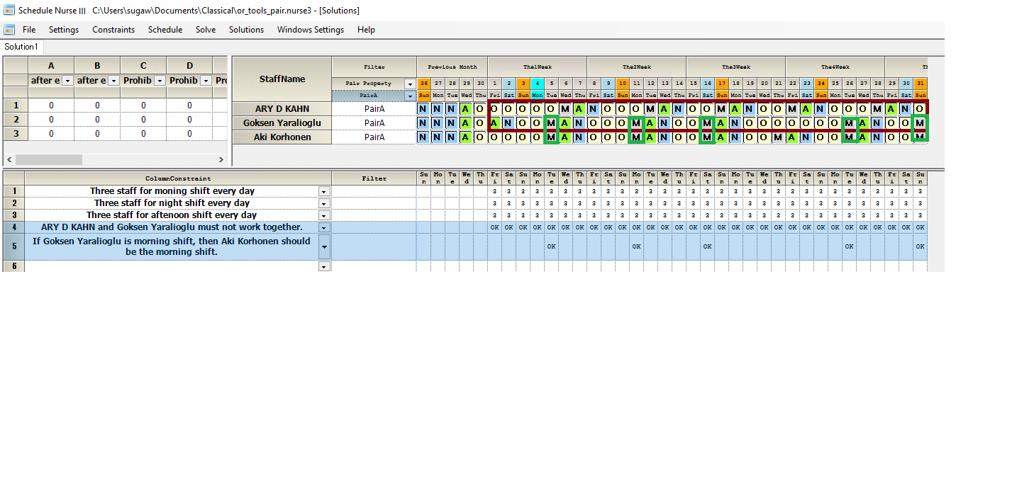 To avoid no solutions, we strongly recommend using soft constraints. Because this constraint significantly reduces the solution space. If you wish to achieve the same shift for both staff, describe from both directions.